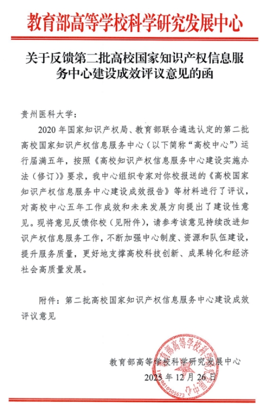 近日,贵州医科大学国家知识产权信息服务中心(挂靠图书馆)按照教育部要求,圆满完成第二批高校国家知识产权信息服务中心五年建设成效评估工作,获评估专家高度认可。