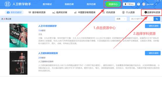 下载“人卫教学助手”并安装(如已安装,请忽略)。输入账号密码登录教学助手,点击资源中心,选择学科资源,勾选需要浏览的学科资源后确认即可浏览,如页面为空,请点击右侧的“选择学科资源”进行勾选获取。